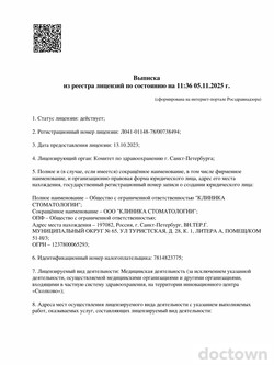 Стоматологическая клиника предоставляет услуги по стоматологии, включая терапию, ортопедию, ортодонтию, хирургию, имплантацию. Прием проводится по предварительной записи.
